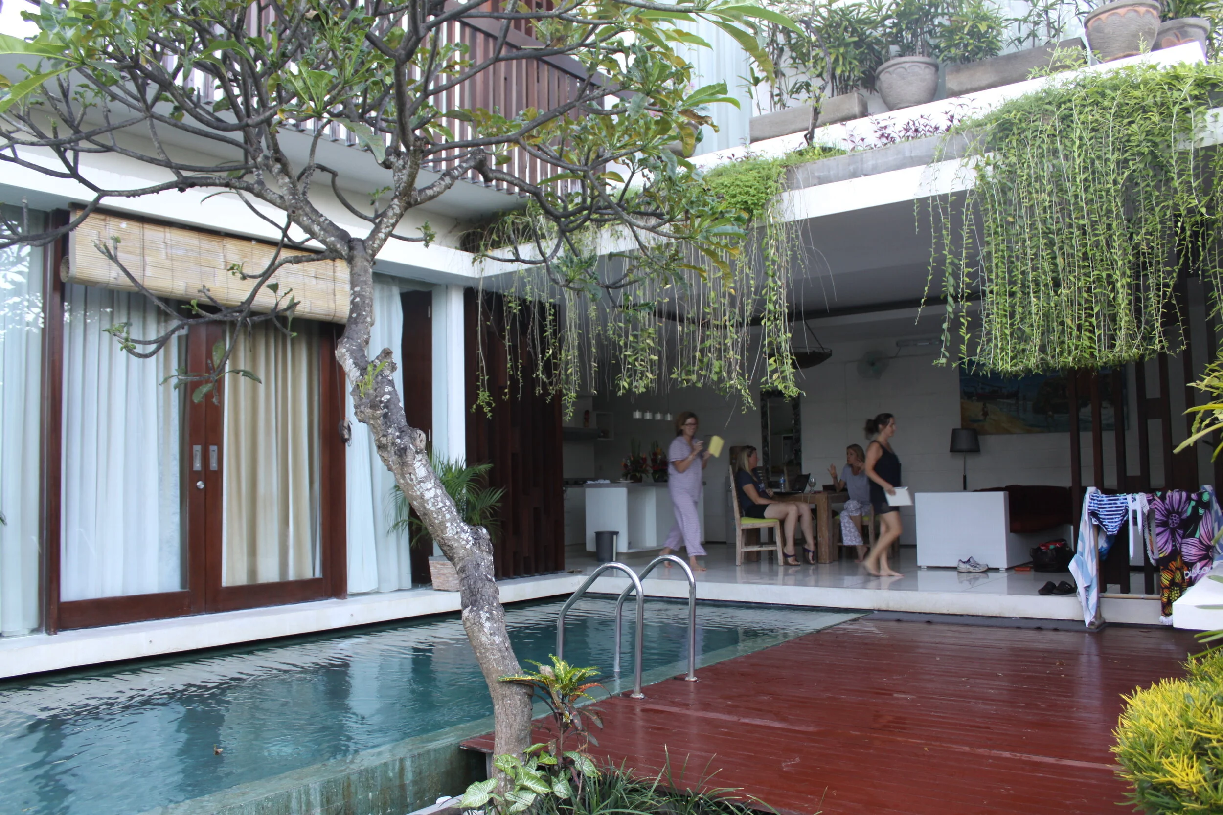 Our villa was down a narrow side street that sailed past cows sitting in paddocks of long grass, burnt out buildings, small fields of green, building sites, slums and rambling driveways. At the end of the road, the van came to a halt and we dubiously walked down a laneway of stepping stones, emerging in a beautiful oasis of frangipanis, statues and waterfalls; our villa was magnificent! Our host, Putu, showed us around and introduced us to our own private chef who proceeded to cook up a storm for us while we paddled in our own private pool! The meal was scrumptious and now we await the arrival of the other 3 girls, excited about what tomorrow will bring!