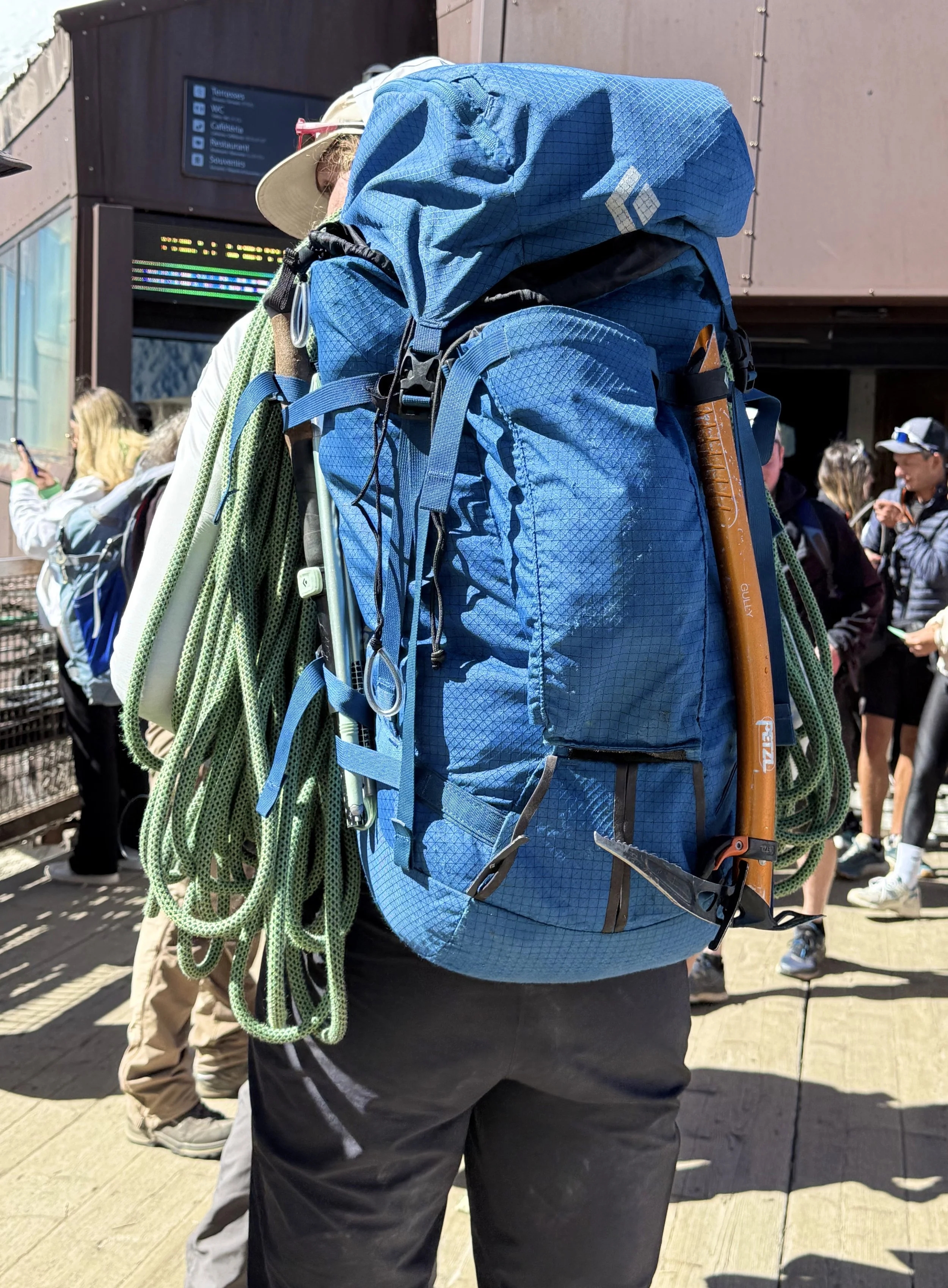 Speaking of climbers, when we were waiting in line for our return trip down the mountain, we spotted a guy with a roll of rope on his arm and the biggest collection of carabiners I’ve ever seen in my life. They would’ve weighed a ton! His water bottle was ENORMOUS! I’m surprised he didn’t need a separate backpack just to carry it. So many people started gathering in the holding bay for our cable car, we were all wondering how we were going to fit in. Carabiner Man would have weighed as much as 4 guys at least with all those accessories. Oh well, if anything was going to happen to our overloaded cabin, at least he had enough carabiners to strap each of the 65 passengers to his belt and swing us to safety.