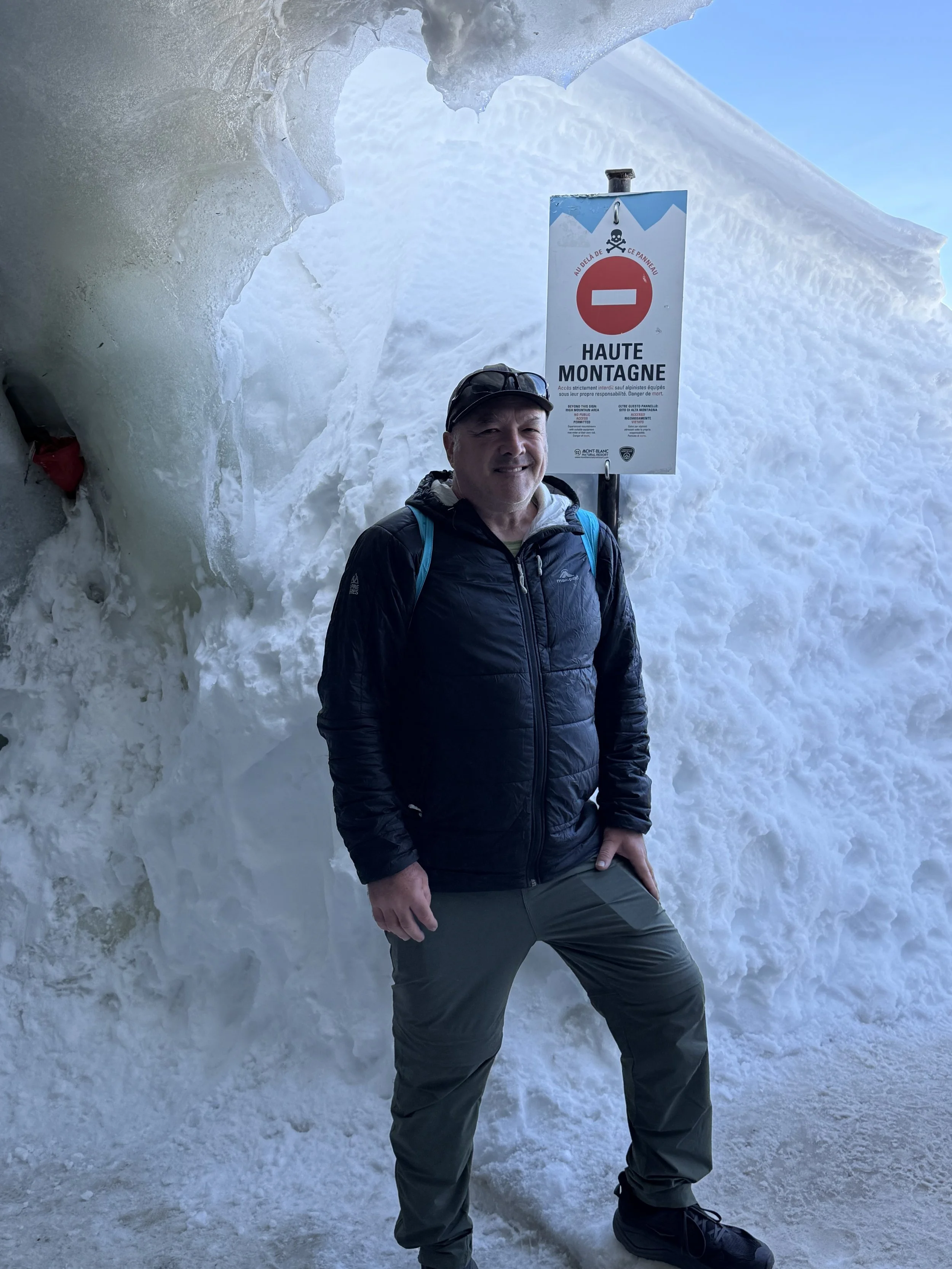 I was surprised with the pace of the cog train as it glided up the face of the mountain towards the glacier. There were lots of oohs and ahhs as we approached the tree-line and the snow-topped peaks became visible in all their glory, the morning sun glinting off their tops and almost blinding us with the glare. The village of Chamonix had shrunk down to ant-ville, cars and people only just visible from our lofty perch. As soon as the doors opened for us to disembark, the fresh, cool air hit us and everyone grabbed for their extra layers. Everyone except Ross that is, who decided to take his chances in his sleeveless vest and t-shirt.